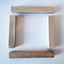 Umwickeln Sie die Ecken mit dem Klebeband, um diese aneinander zu pressen, bis der Leim vollständig ausgehärtet ist. Das dauert ca. 1 Stunde. Anschließend können Sie die übrigen 4 Leisten zwischen die beiden Rahmen anbringen, sodass diese einen Würfel bilden. Lassen Sie die verleimten Leisten erneut aushärten. Auch hier verwenden Sie am besten Klebeband zum Fixieren der verleimten Holzleisten.