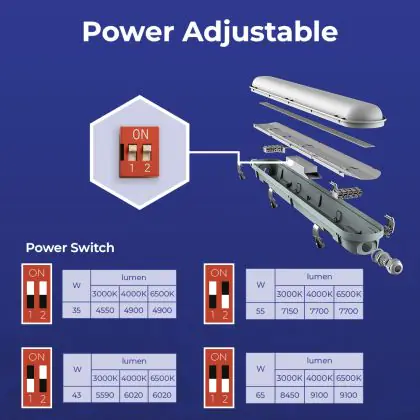 Die Noxion Poseidon V2.0 wird mit einer Leistung von 55 Watt betrieben. Sie ersetzt dabei vergleichbare Lampen mit einer Leistung von 2x58 Watt – ohne dabei Leuchtkraft einzubüßen. Betreiben Sie sie für 60 Stunden die Woche, so ergibt sich ein Gesamtwert von 171 kWh im Jahr. Bei einer konventionellen Lampe läge dieser Wert bei 362 kWh. Sie sparen mit der Lampe somit rund 53 % Energiekosten.