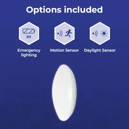 Die Noxion LED-Wand- und Deckenleuchte Corido V2 Weiß 12/16/20W 2000lm 830-840-865 CCT | IP44 - Bewegungs- und Lichtsensor - Not 3H ist eine Feuchtraumleuchte. Sie strahlt Licht in der Farbtemperatur aus und punktet durch eine lange Lebensdauer. Diese Leuchte ist speziell zur Verwendung in Feuchträumen (Keller, Waschräume, etc.) vorgesehen.