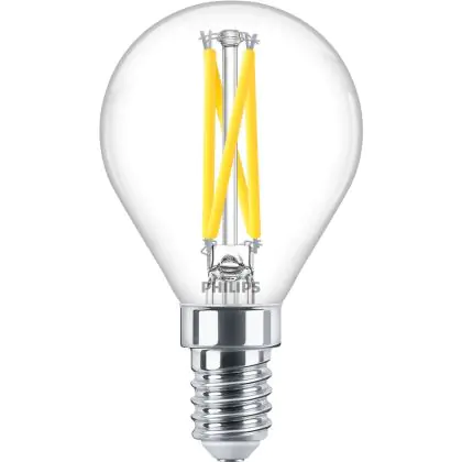 Die Philips MASTER LED E14 Kugel Fadenlampe Klar 2.5W 340lm - 922-927 Dim To Warm | Höchste Farbwiedergabe - Dimmbar - Ersatz Für 25W ist eine effiziente E14 LED-Lampe mit Retrodesign und der perfekte Ersatz für Ihre konventionellen 25W Lampen mit E14. Zudem strahlt sie Licht in der Farbtemperatur 2200K - 2700K Dim To Warm aus und punktet durch eine lange Lebensdauer.